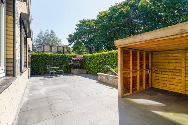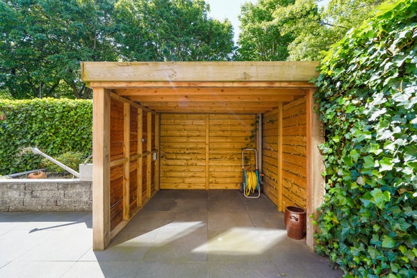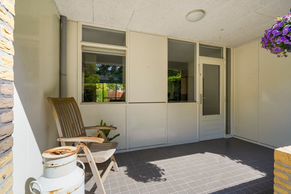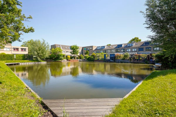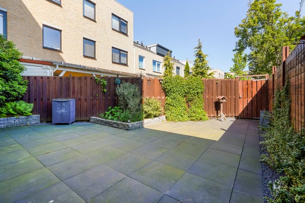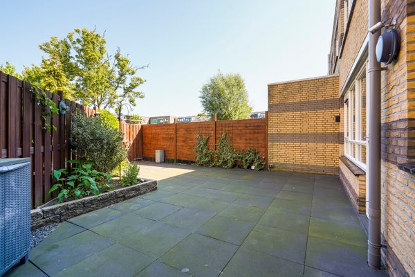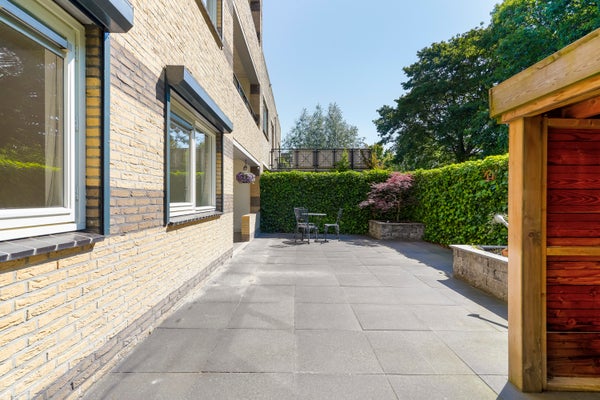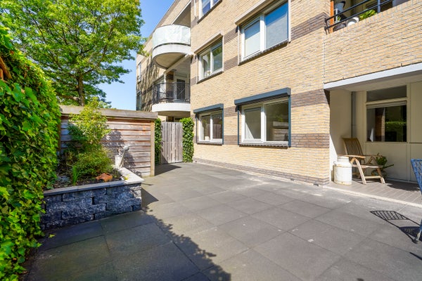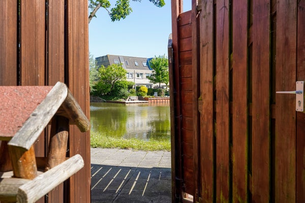 De zonnige voortuin op het zuiden is fraai aangelegd en beschikt over een terras, een ruime berging en een groen uitzicht op de boomkruinen. De voortuin meet circa 50 m² en het terras bijna 8 m², en is bereikbaar via een eigen afgesloten ingang. Aan de achterzijde bevindt zich een achtertuin van circa 32 m² met achterom, die toegang biedt tot de aangrenzende waterpartij. Tevens is er via de buitenzijde van het complex nog een extra afgesloten berging aanwezig.