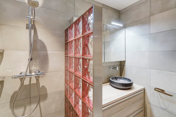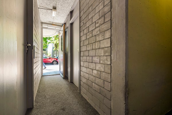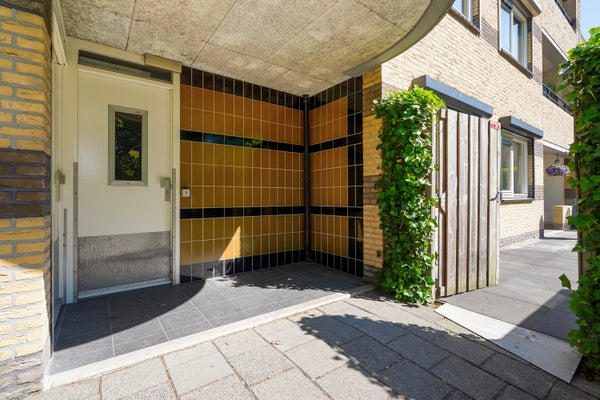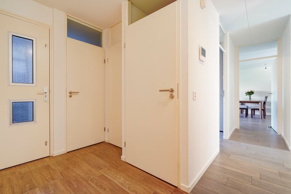 De afgesloten hoofdentree van het kleinschalige complex (8 appartementen) is voorzien van een bellentableau. Vanuit hier bereik je de voordeur van het appartement. In de hal vind je links de luxe betegelde badkamer met inloopdouche, badmeubel en toilet. Daarnaast is er een separaat toilet met fonteintje en een praktische halkast met daarin de groepenkast.