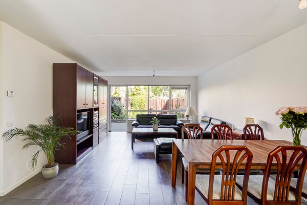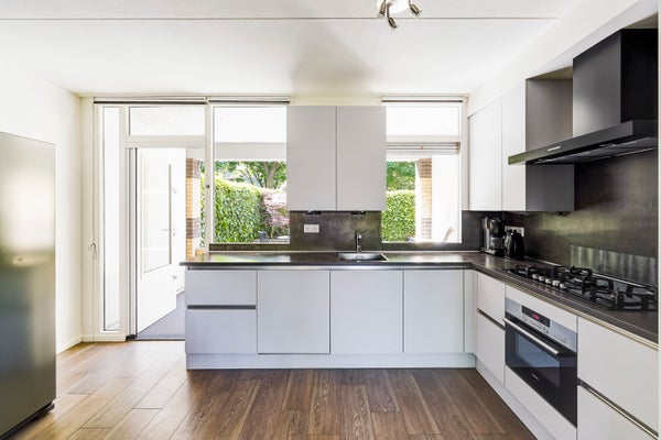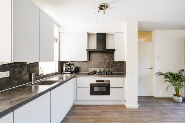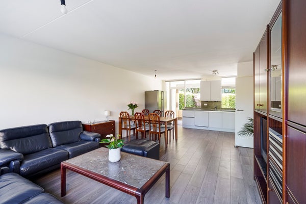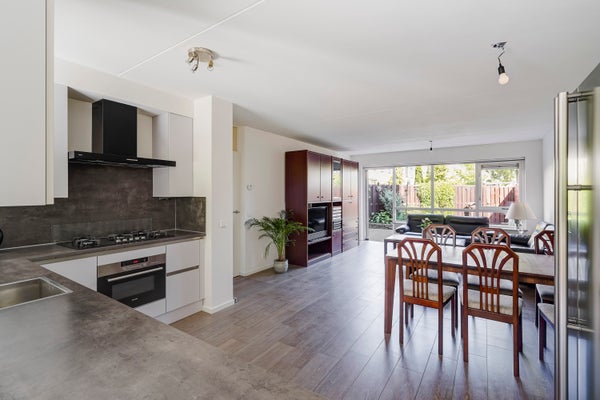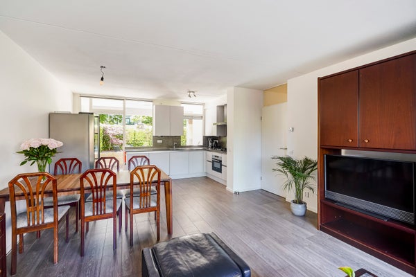 De lichte woonkamer met open keuken vormt het hart van de woning. Dankzij ramen aan beide zijden valt er veel natuurlijk licht naar binnen en vanuit de zithoek kijk je direct uit op de achtertuin. De keuken is compleet uitgerust met onder andere een kookplaat met afzuigkap, combimagnetron en vaatwasser. De totale woonruimte bedraagt ruim 33 m².