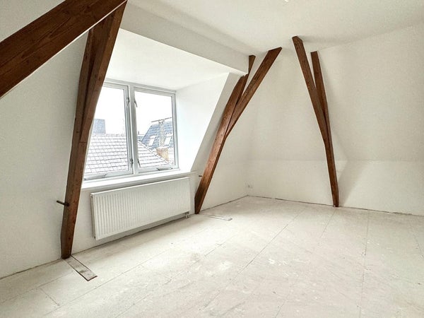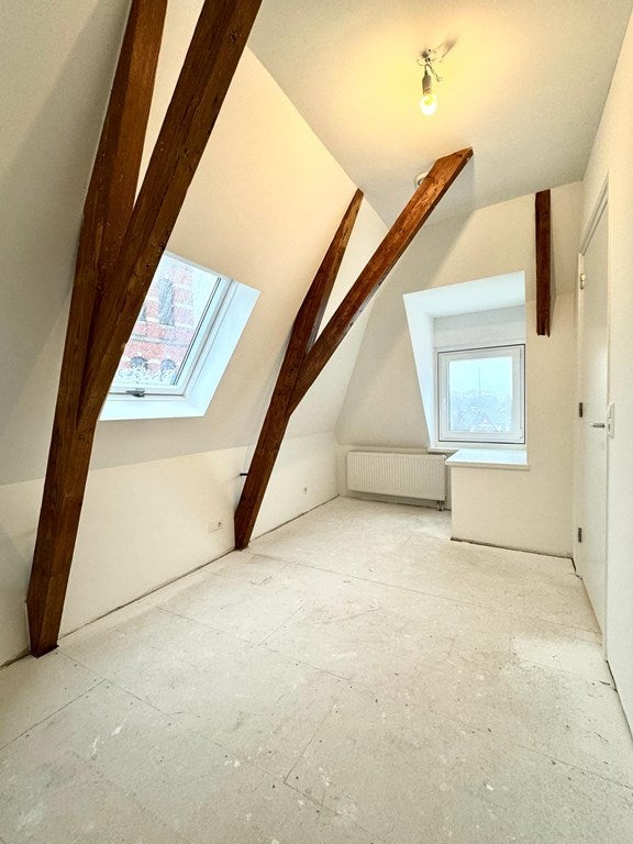 Via de entree betreed je het appartement van 90m2 op de eerste verdieping en neem je direct de trap omhoog naar de woonkamer met open keuken. De keuken is modern uitgevoerd en voorzien van een inductiekookplaat, koelkast, vaatwasser en een combinatie oven-magnetron. De badkamer beschikt over een douche en wastafelmeubel. Het appartement heeft twee ruime slaapkamers en een frans balkon.