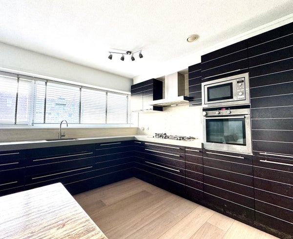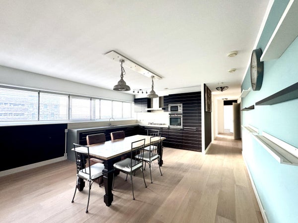 De ruime keuken is voorzien van eigentijdse inbouwapparatuur en sluit naadloos aan bij de stijlvolle afwerking van het appartement. De badkamer is verzorgd afgewerkt en volledig betegeld. Het appartement beschikt verder over een interne bergruimte met aansluiting voor de wasmachine en droger.