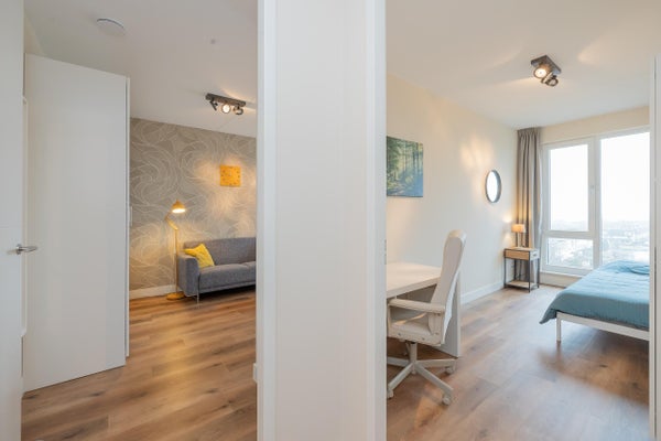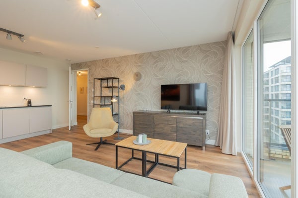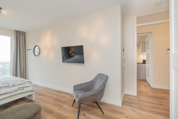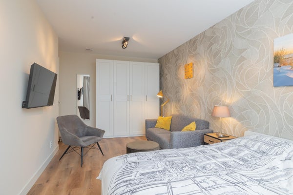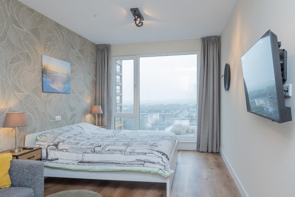 Het appartement beschikt over twee goed bemeten slaapkamers, de hoofdslaapkamer is ingericht met een tweepersoonsbed, kastruimte en een zithoek met extra TV waardoor er een rustige, hotelachtige sfeer heerst. De tweede slaapkamer welke zich tussen de woon, en hoofdslaapkamer bevind is flexibel inzetbaar als logeerkamer, werkkamer of kinderkamer.