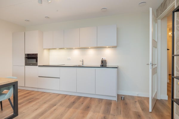 De open keuken is strak en modern uitgevoerd en volledig geïntegreerd in de leefruimte. Deze is voorzien van alle benodigde inbouwapparatuur, waaronder een inductiekookplaat, combi-oven, vaatwasser, koelkast en vriezer. De keuken biedt veel werk,- en kastruimte en sluit perfect aan bij het wooncomfort van het appartement.