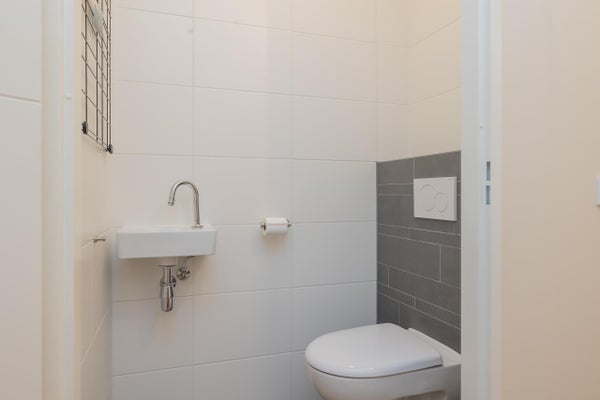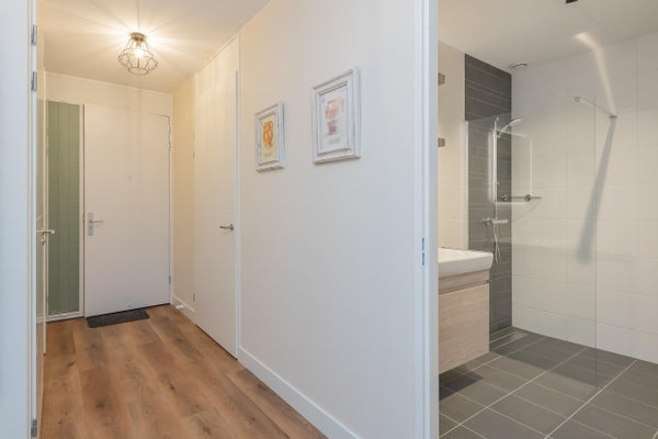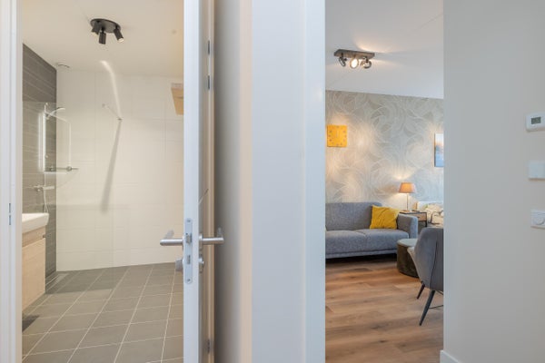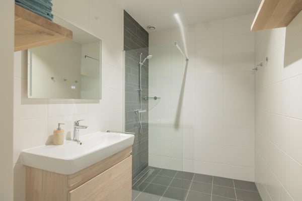De moderne badkamer is strak afgewerkt met lichte wandtegels en een donkere vloer en voorzien van een ruime inloopdouche, wastafelmeubel en verlichte spiegel. Het toilet is separaat gesitueerd in de hal.