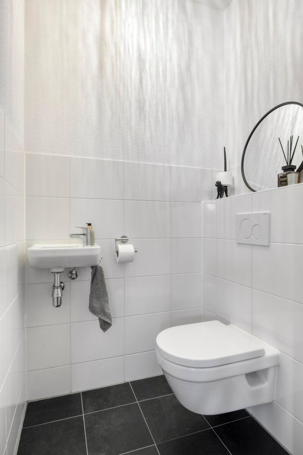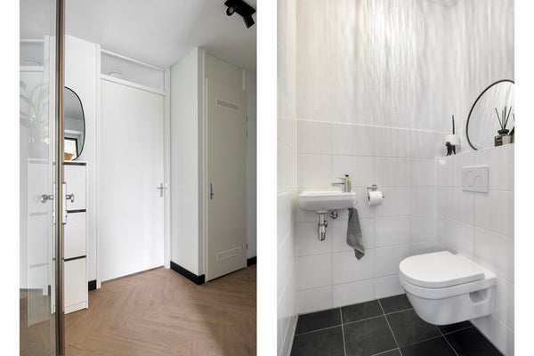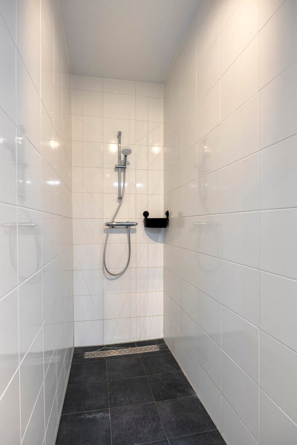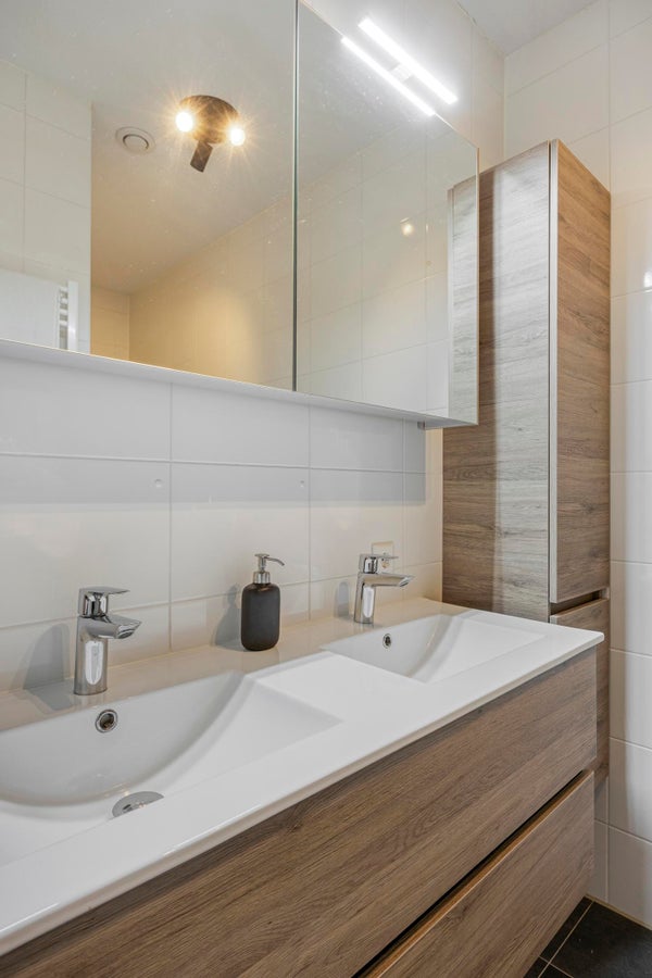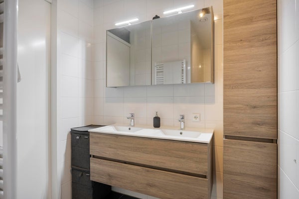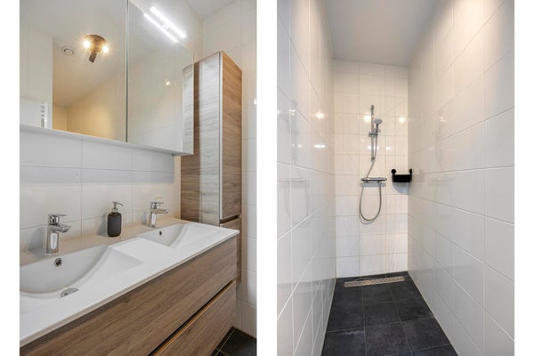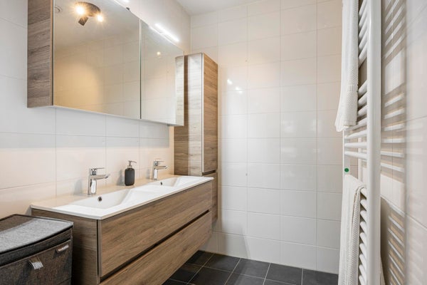 De inpandige badkamer is, net als de keuken, modern afgewerkt en voorzien van een ruime inloopdouche, dubbele wastafel en elektrische handdoekenradiator. Het toilet is apart gerealiseerd en te bereiken via de hal.
