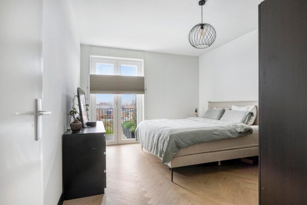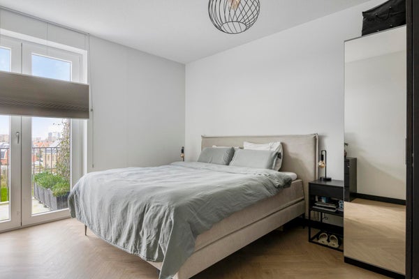 De master bedroom bevindt zich eveneens aan de achterzijde van het complex en is ruim genoeg voor het plaatsen van een tweepersoonsbed en een ruime kledingkast. De master bedroom biedt, net als de woonkamer, toegang tot het balkon.
