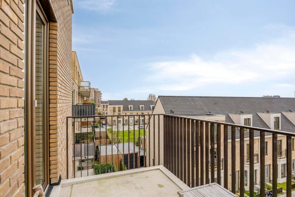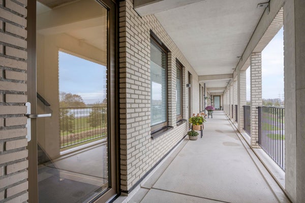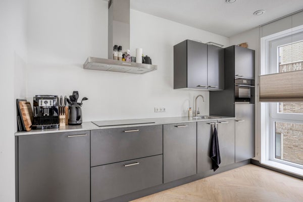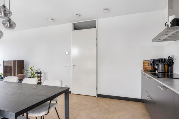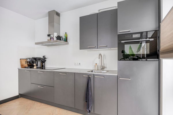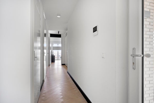 De voordeur brengt u in de hal van de woning, welke alle kamers met elkaar verbindt. De ruime woonkamer met open, moderne keuken bevindt zich aan de zijkant/achterkant van de woning. Met ramen aan twee zijden is de kamer zeer licht. De moderne keuken is een ware eyecatcher en is zeer compleet in haar voorzieningen, te denken aan een inductiekookplaat, afzuigkap, combi-oven/magnetron, koelkast, vriezer, vaatwasser en meer dan voldoende kastruimte. De woonkamer met open keuken biedt toegang tot het ruime balkon (ligging: Noordwest) aan de achterzijde van het complex, vanwaar u vrij uitzicht heeft op de achter het complex gelegen groenstrook.
