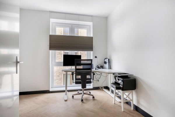 De tweede slaapkamer is te vinden aan de voorzijde van het complex, met ramen en zicht op de zijkant van het gebouw. Deze kamer is op dit moment ingericht als kantoor, maar kan ook prima dienstdoen als hobbykamer. Wij laten de inrichting graag aan de nieuwe bewoners over.