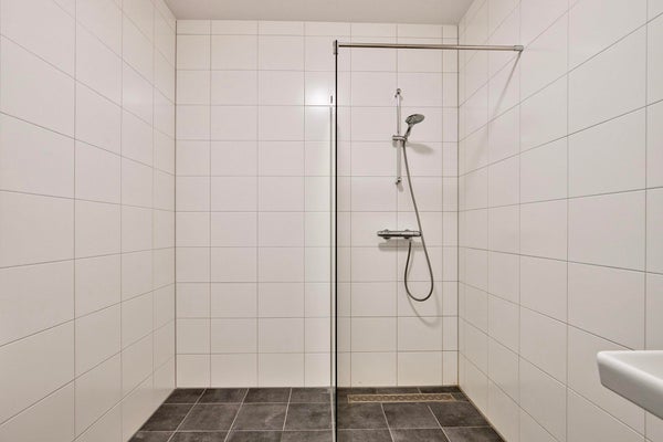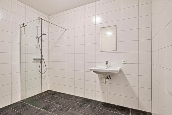 De badkamer wordt uitgevoerd met een douche en wastafel. Het toilet is separaat gerealiseerd en bereikbaar via de hal. De aansluitingen voor wasmachine en droger bevinden zich in de wasruimte.