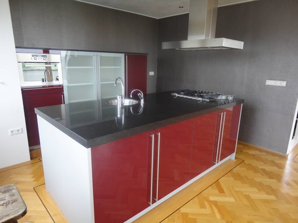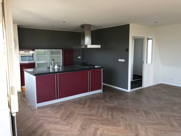 Eerste verdieping: Entree bovenwoning. Hal met apart toilet en toegang tot alle vertrekken. Woonkamer (ca. 70 m2) voorzien van pvc vloer in visgraatmotief en schuifpui naar een breed balkon. Luxe, open keuken voorzien van werkeiland, gaskookplaat met afzuigkap, koelkast met vriesvak, afwasmachine, combimagnetron en quooker.