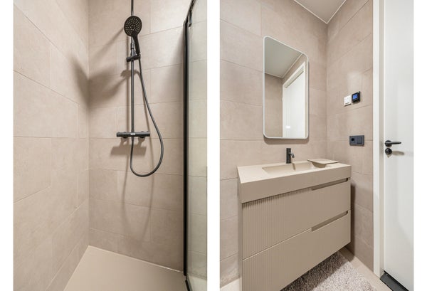 De badkamer is volledig betegeld en voorzien van een inloopdouche en wastafel met meubel.