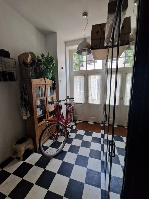 Eigen entree met hal en een ruime berging, ideaal voor fietsen, voorraad of opslag.