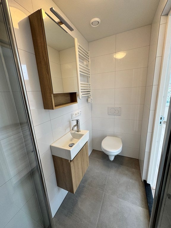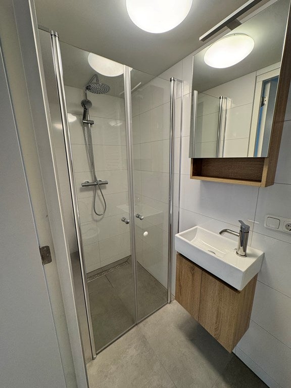 Het tweede appartement (85E, foto 7 t/m 12) bevindt zich op de tweede etage en beschikt over een ruime woonkamer met een open keuken, met een oppervlakte van circa 15 m². De keuken is voorzien van moderne apparatuur, waaronder een inductiekookplaat, afzuigkap, koelkast, combioven en vaatwasser. Daarnaast beschikt het appartement over een aparte slaapkamer met een oppervlakte van circa 12 m². De badkamer is uitgerust met een douche, wastafel en toilet, en heeft een oppervlakte van circa 2 m².