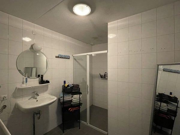 Verzorgde badkamer met douchehoek en wastafel