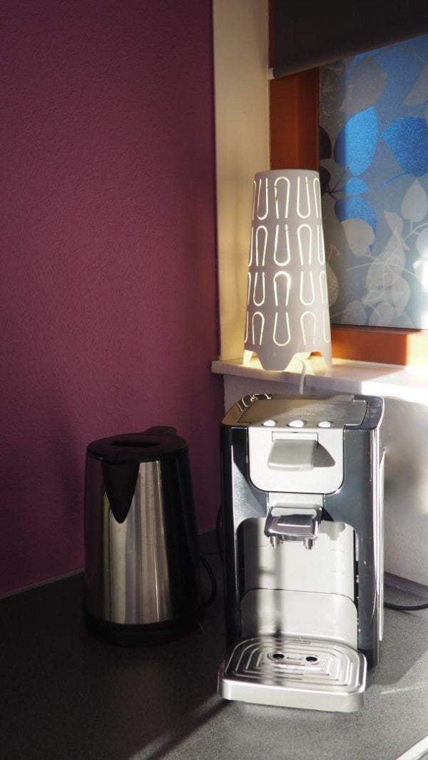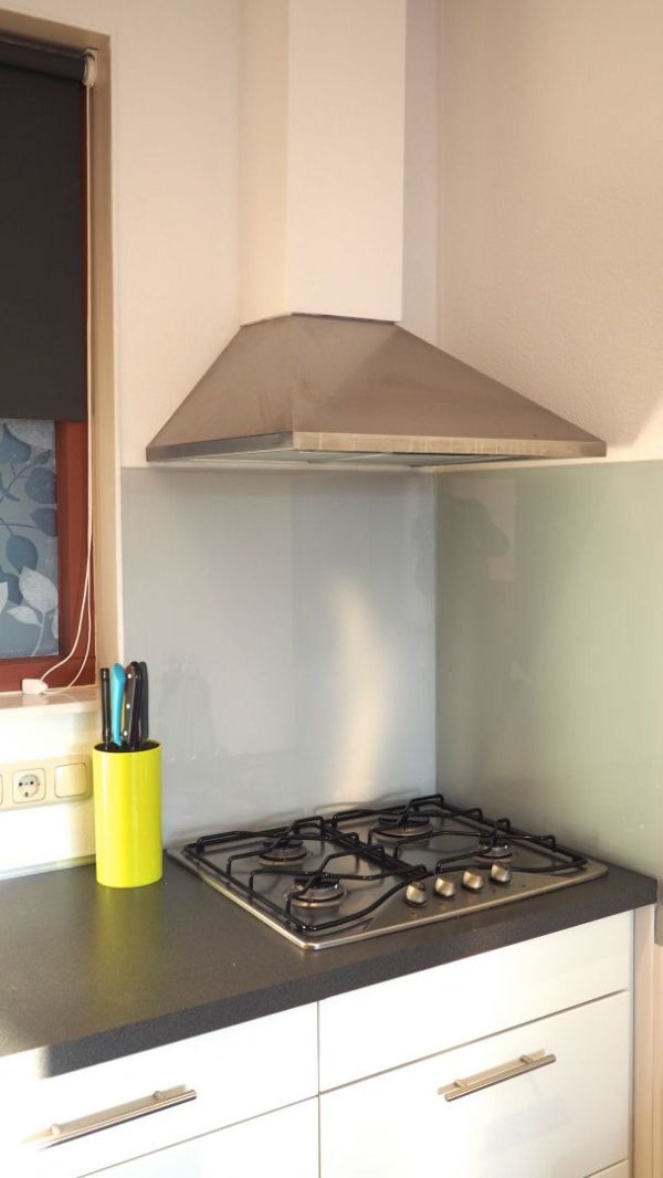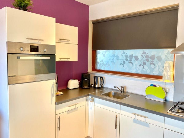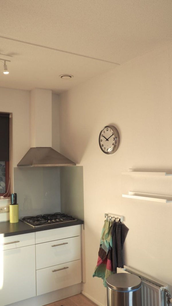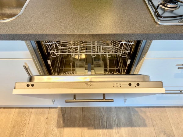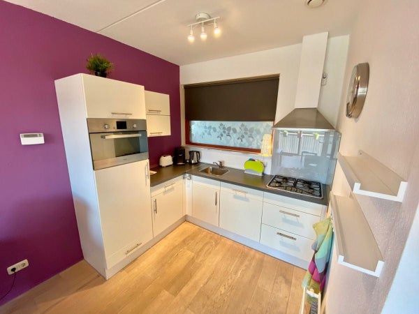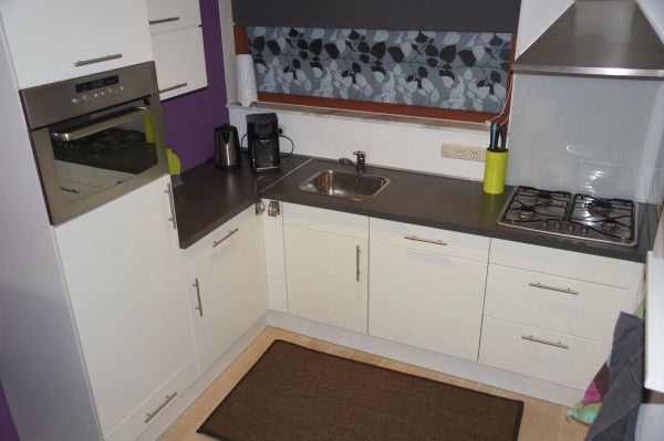 • Open keuken met gasfornuis, inbouw oven/magnetron combinatie en losse koelkast met vriesvak.