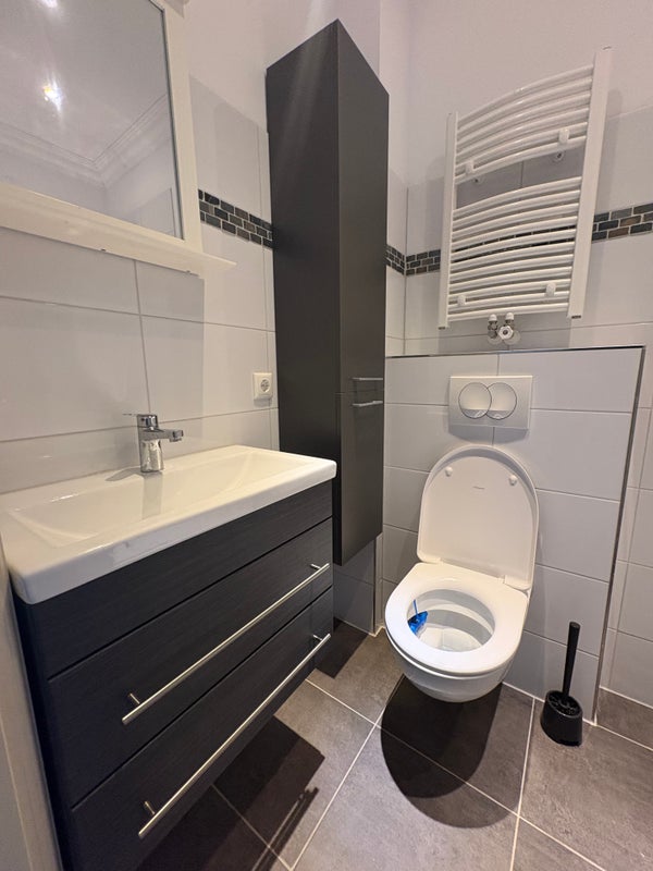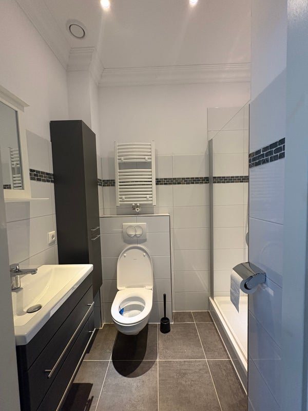 De badkamer zit naast de slaapkamer, en is voorzien van een hangtoilet, douche, design radiator en een wastafel.
