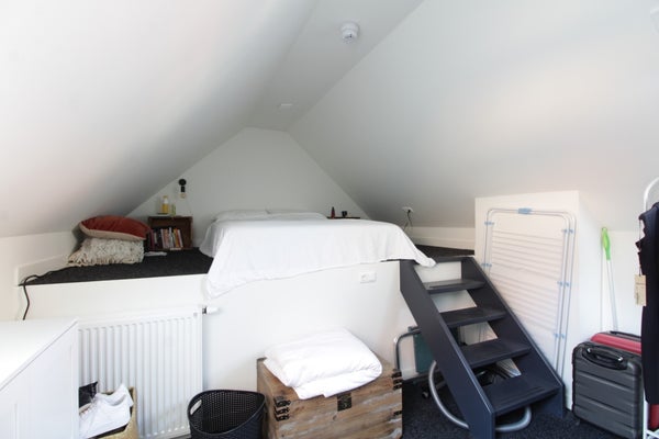 Trap naar riante slaapkamer met trapje naar het aparte slaapgedeelte.
