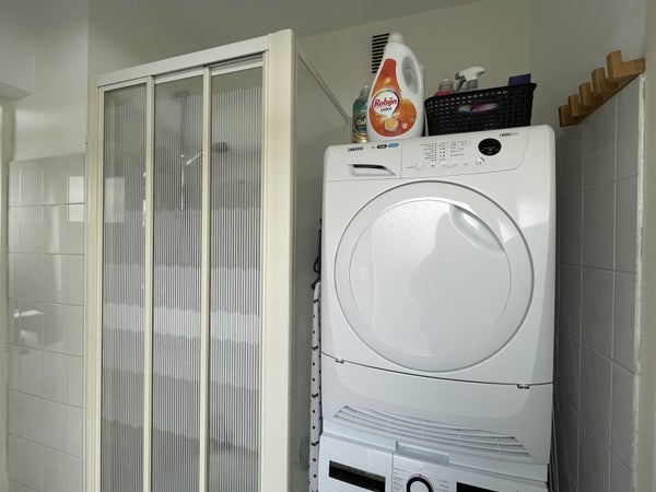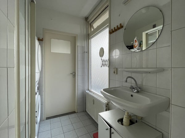 De badkamer is recent gerenoveerd en netjes afgewerkt. Hier vind je een douche, wastafel en aansluiting voor de wasmachine.