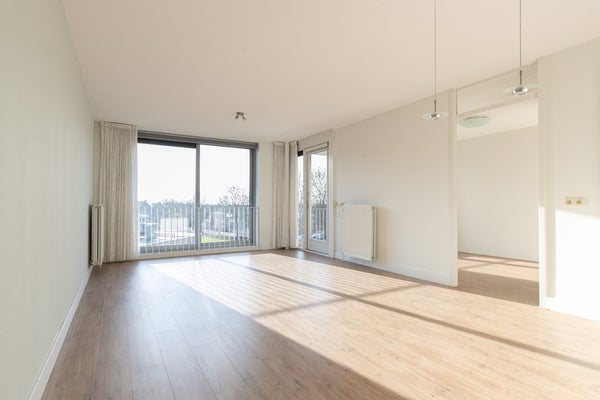 De woonkamer is eveneens licht en ruim, met toegang tot het balkon en aan de zuidzijde een Frans balkon met grote schuifdeuren.