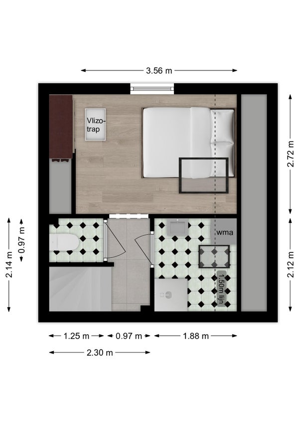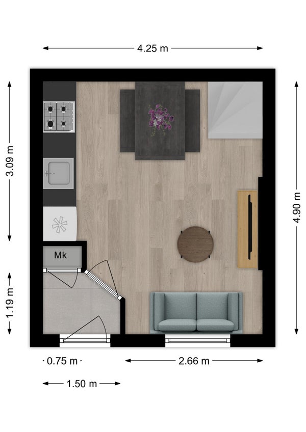 - De beneden + bovenwoning heeft een woonoppervlakte van 40 m² en beschikt over 2 kamers, waarvan 1 slaapkamer;