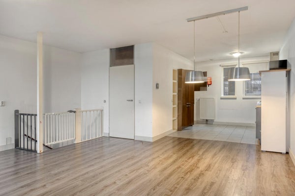 Via de entree bereikt u de hal met meterkast en toiletruimte. De royale woonkamer (ca. 28 m²) is licht en ruimtelijk opgezet en biedt toegang tot zowel het balkon (ca. 5,5 m²) via de schuifpui, als de open keuken (ca. 12 m²).De keuken is voorzien van inbouwapparatuur oa. vaatwasser, oven/magnetron. Vanuit de woonkamer is tevens de trap naar de begane grond bereikbaar.