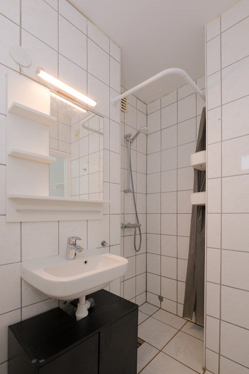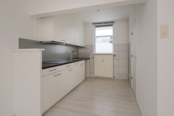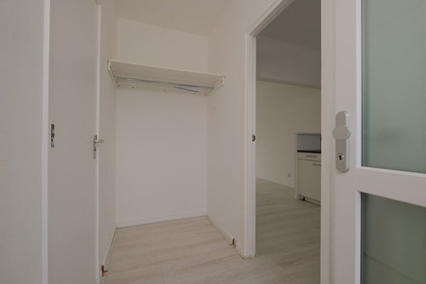 Entree, hal met toegang tot volledig licht betegelde badkamer met inloopdouche, toilet en wastafelmeubel. Lichte woonkamer voorzien van laminaat met open keuken voorzien van diverse inbouwapparatuur zoals een inductie kookplaat en afzuigkap. Vanuit de woonkamer is de slaapkamer en de loggia toegankelijk. De slaapkamer heeft een ruime kast/berging.