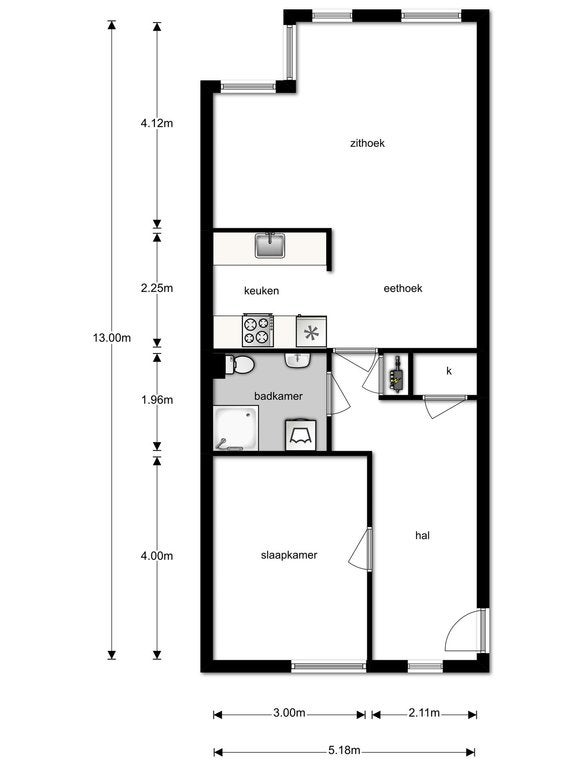 - De galerijflat heeft een woonoppervlakte van 60 m² en beschikt over 2 kamers, waarvan 1 slaapkamer;