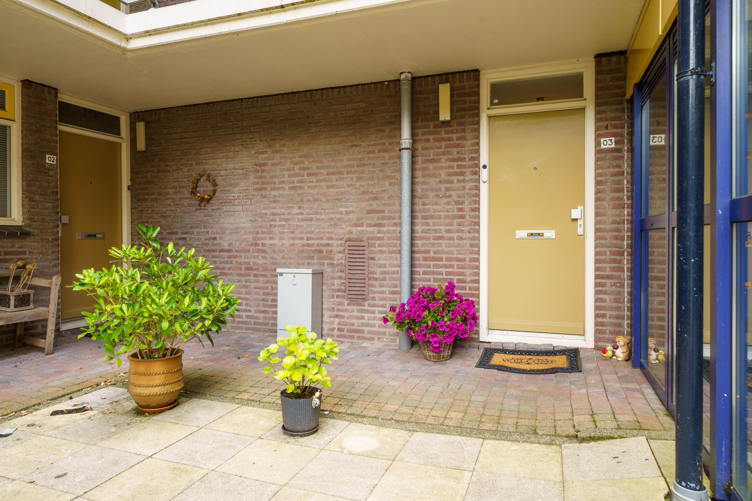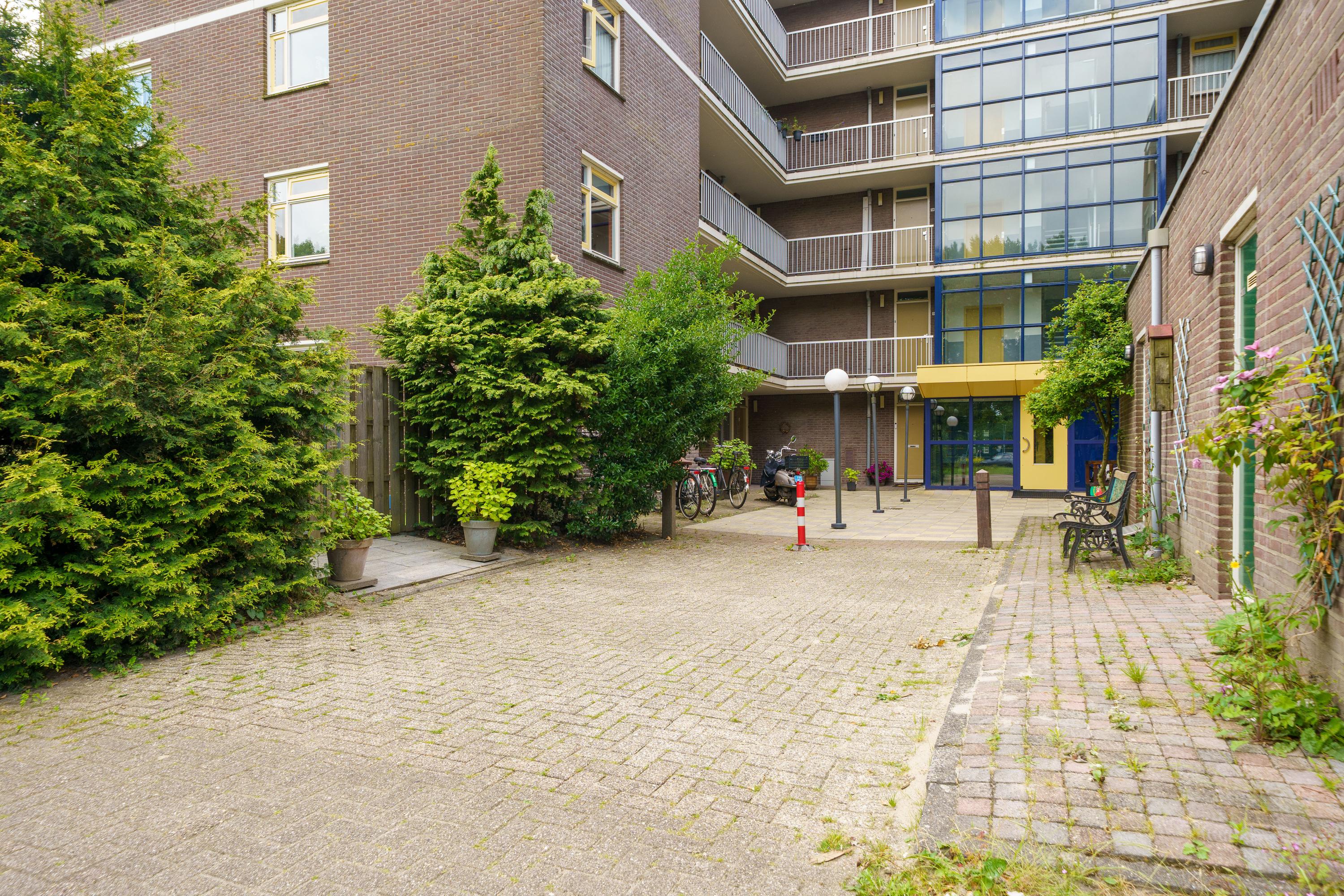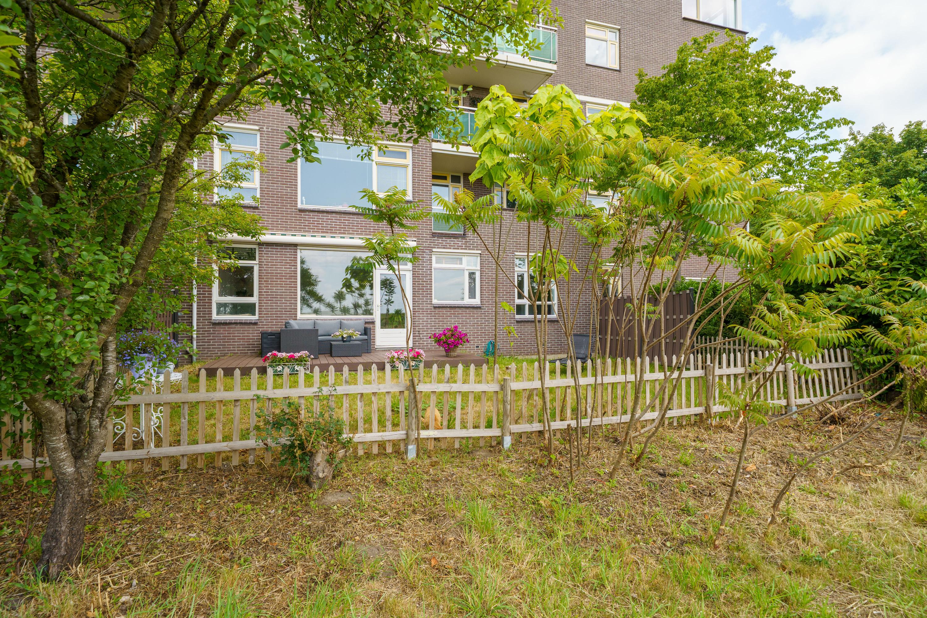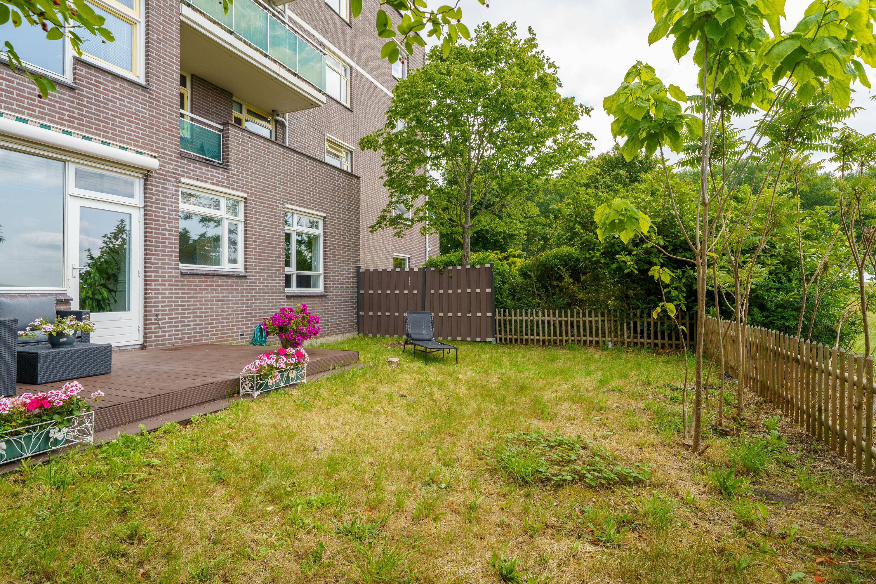 De zonnige tuin op het zuiden, met onderhoudsarm vlonderterras, biedt privacy en uitzicht op een groen plantsoen. Dit gelijkvloerse appartement combineert wonen met comfort en heeft een eigen (fietsen)berging.