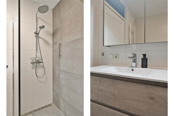 De badkamer is een waar visitekaartje van de woning: strak en modern, met een fijne inloopdouche en een praktisch wastafelmeubel en een toilet.