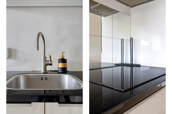 De open, moderne keuken is uitgevoerd in een rechte opstelling en voorzien van boven- en onderkasten. Door de combinatie van lades en bergkasten is er voldoende bergruimte aanwezig. De keuken is uitgerust met een inductiekookplaat, afzuigkap, spoelbak, vaatwasser, oven, combi-magnetron, koel-vriescombinatie en een granieten aanrechtblad.