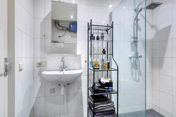 De badkamer is strak uitgevoerd en volledig betegeld tot aan het plafond. Deze is voorzien van een ruime inloopdouche, een wastafelmeubel met spiegel en een toilet. Tevens bevinden zich hier de aansluitingen voor een wasmachine en wasdroger.