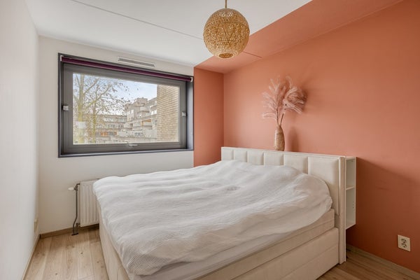 De slaapkamer aan de achterzijde biedt uitzicht op het groene binnenterrein en het park, wat zorgt voor een ontspannen en rustige sfeer. De slaapkamer aan de voorzijde is ideaal als slaap-, werk- of logeerkamer.