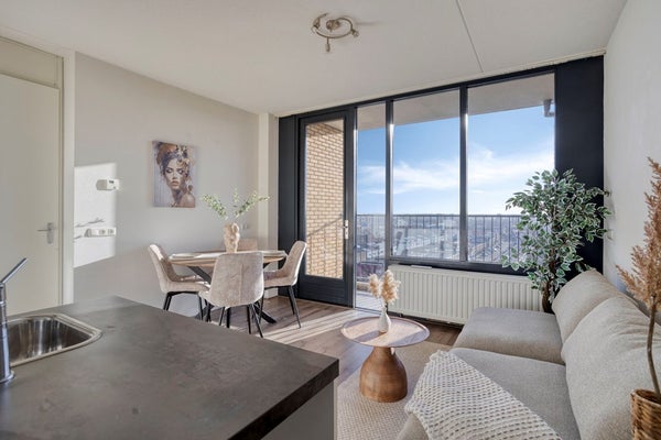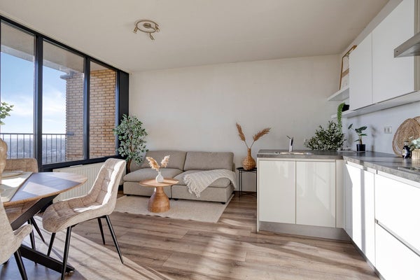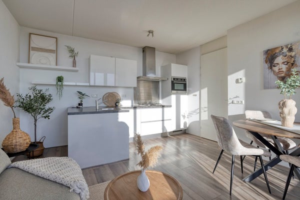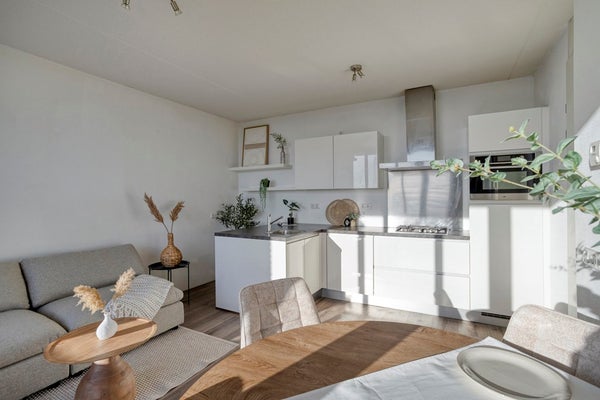 De woonkamer voelt ruim en licht aan en biedt voldoende plaats voor zowel een zit- als eethoek. Dankzij de barfunctie biedt het keukenblad ook de mogelijkheid om hier te eten. De woonkamer is voorzien van een laminaatvloer die is doorgetrokken naar alle ruimtes. Via de woonkamer is het balkon toegankelijk. De woonkeuken is praktisch ingericht en voorzien van diverse inbouwapparatuur, waaronder een gaskookplaat, afzuigkap, combi-oven, vaatwasser (2025) en koel-vriescombinatie.