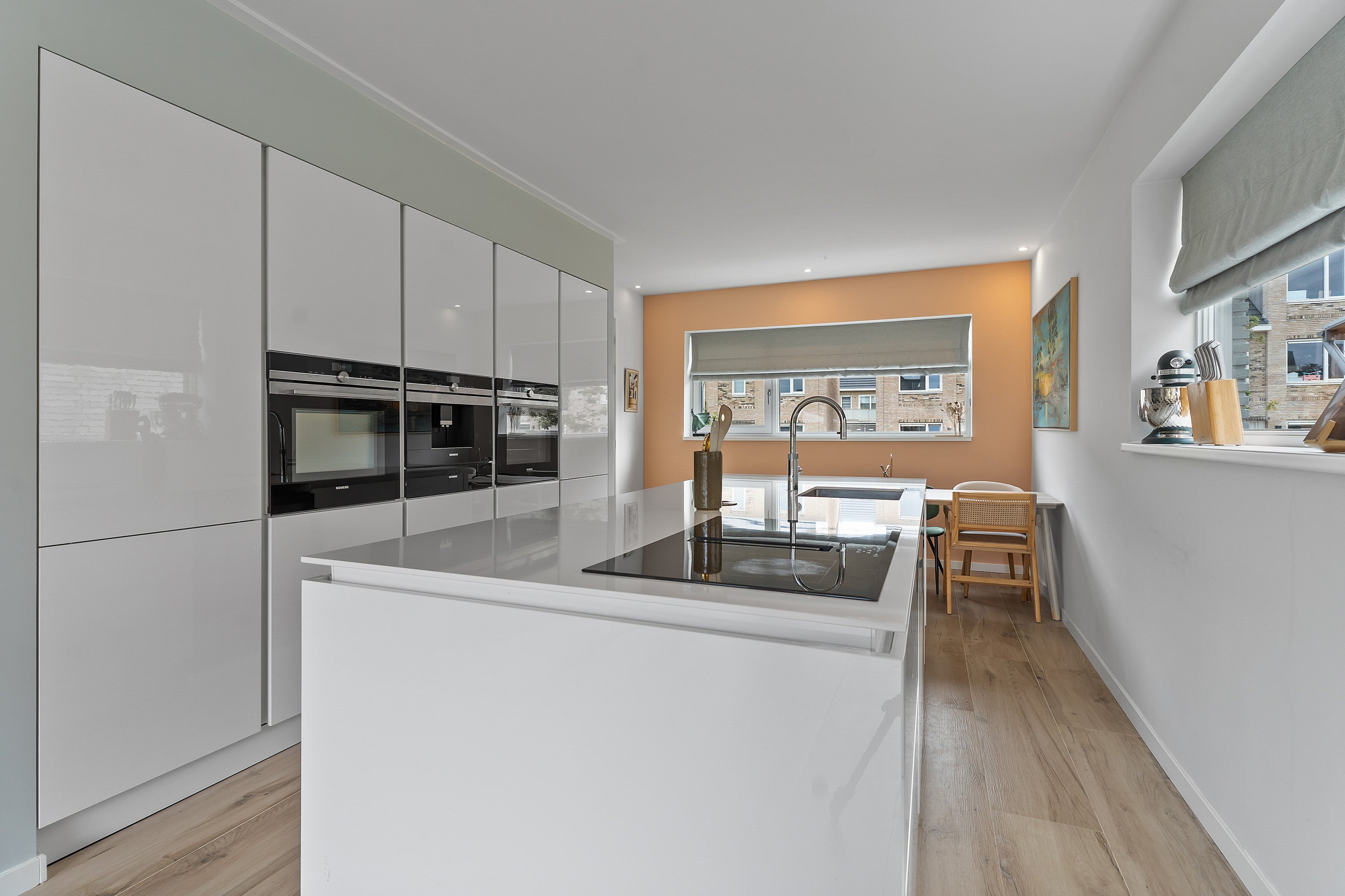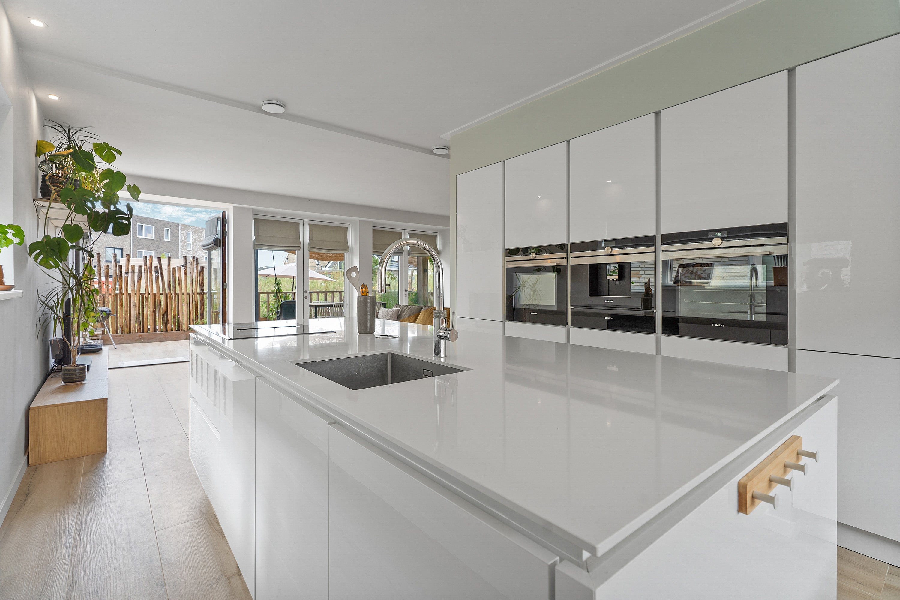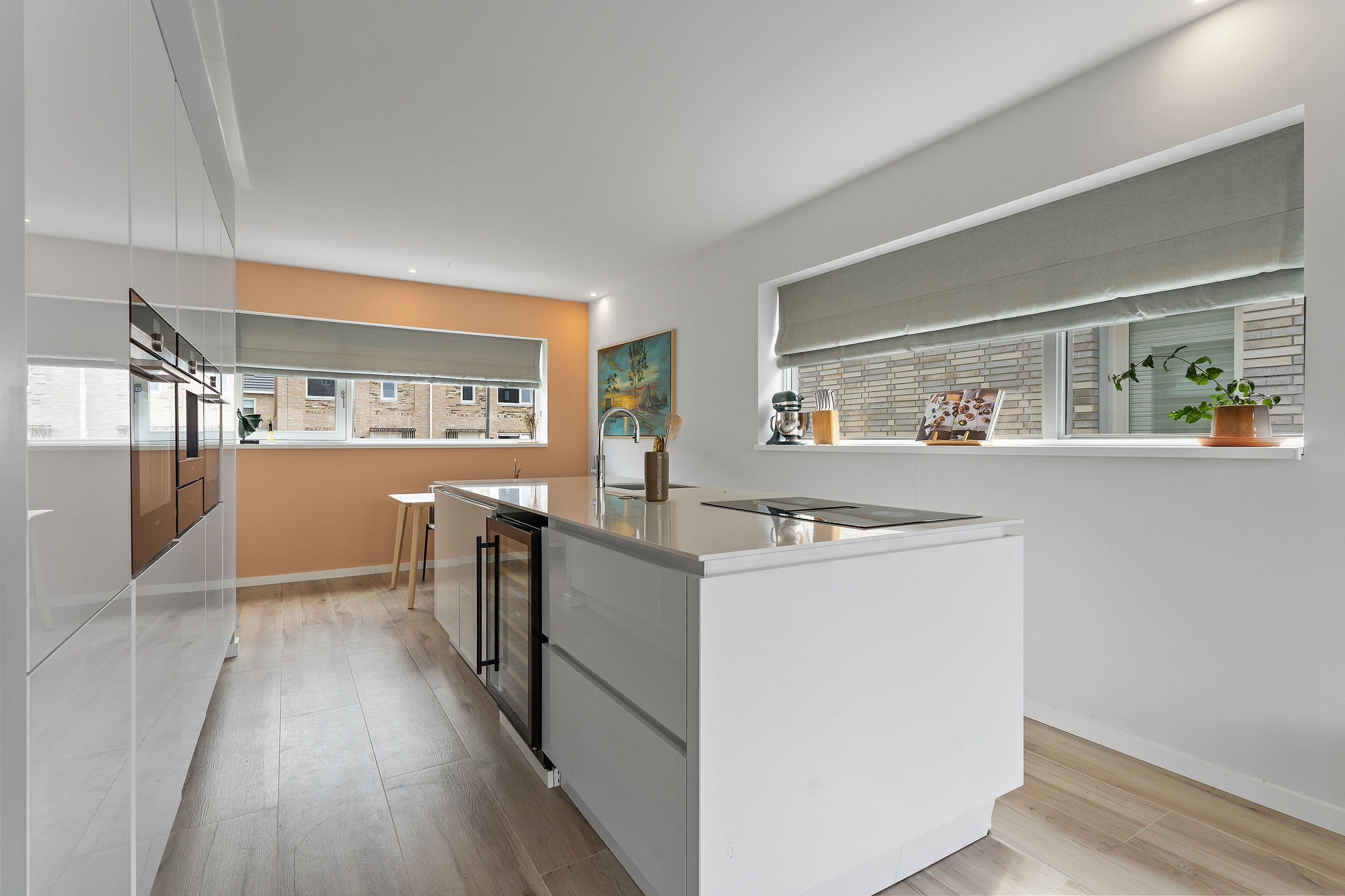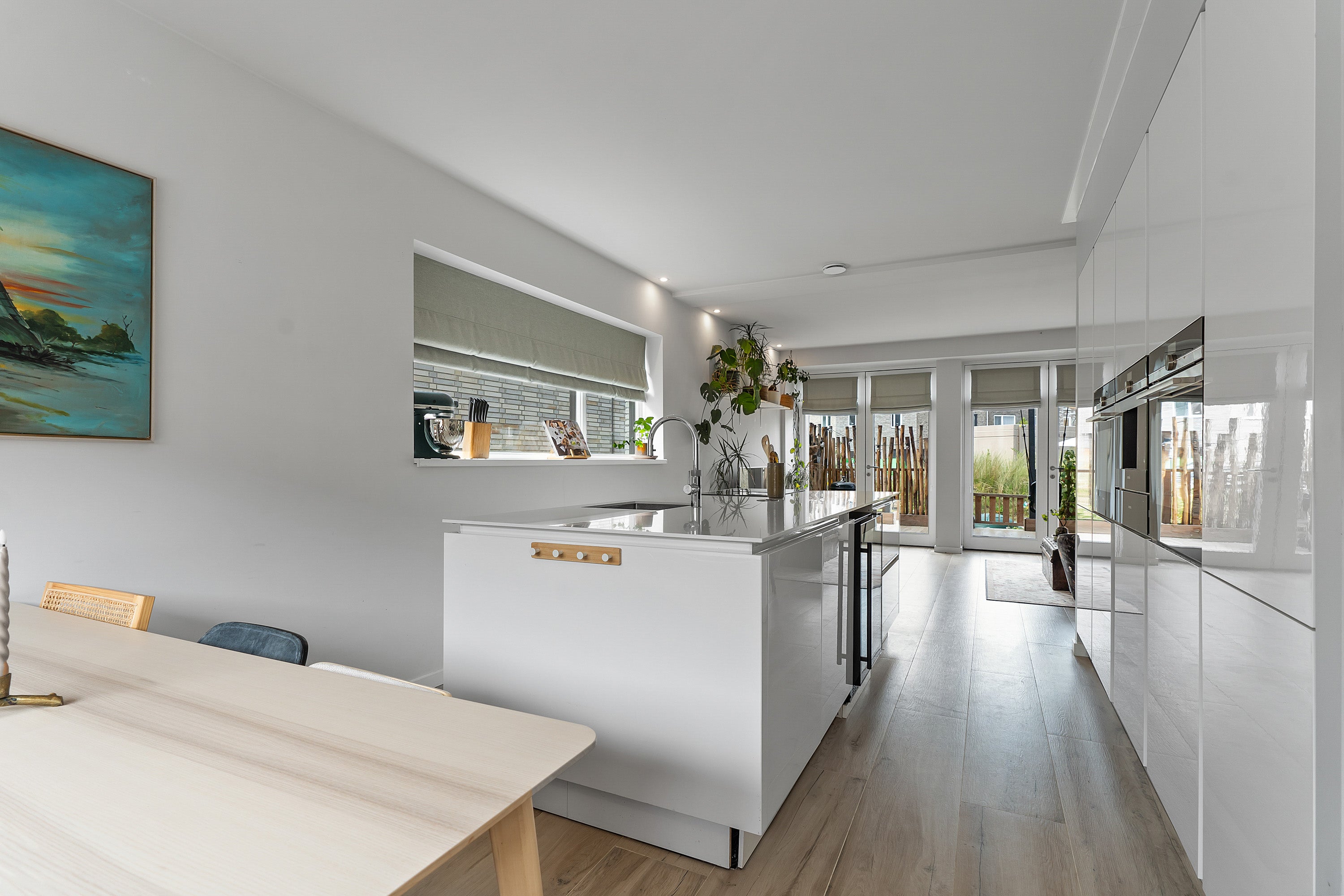 De woonkamer heeft keramisch parket met vloerverwarming en drie openslaande deuren naar het zonnige terras, perfect voor buitenleven. De eerste verdieping is uitgebreid met twee dakkapellen, waardoor extra ruimte is gecreëerd. De luxe badkamer is voorzien van een inloopdouche, ligbad en wastafelmeubel.