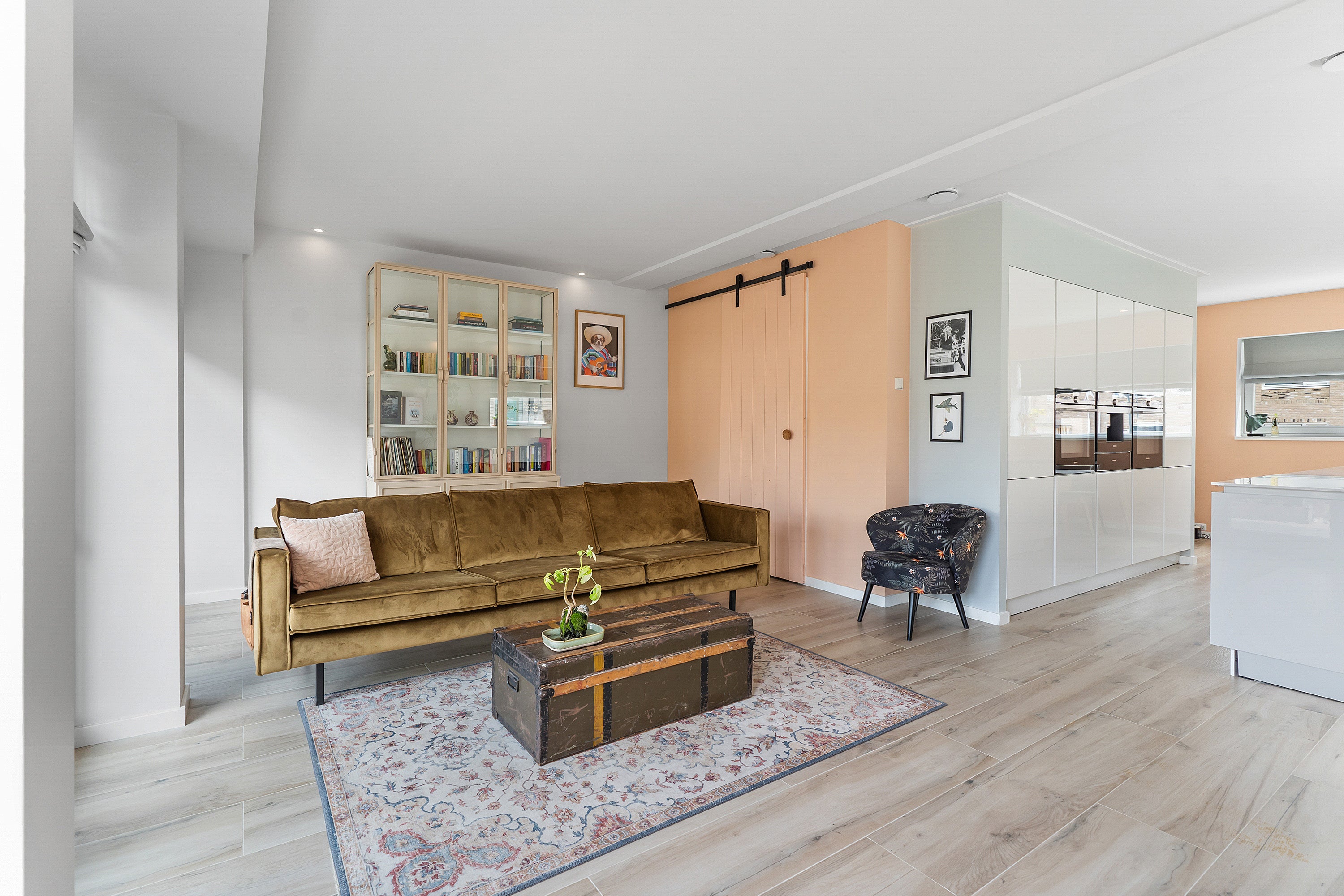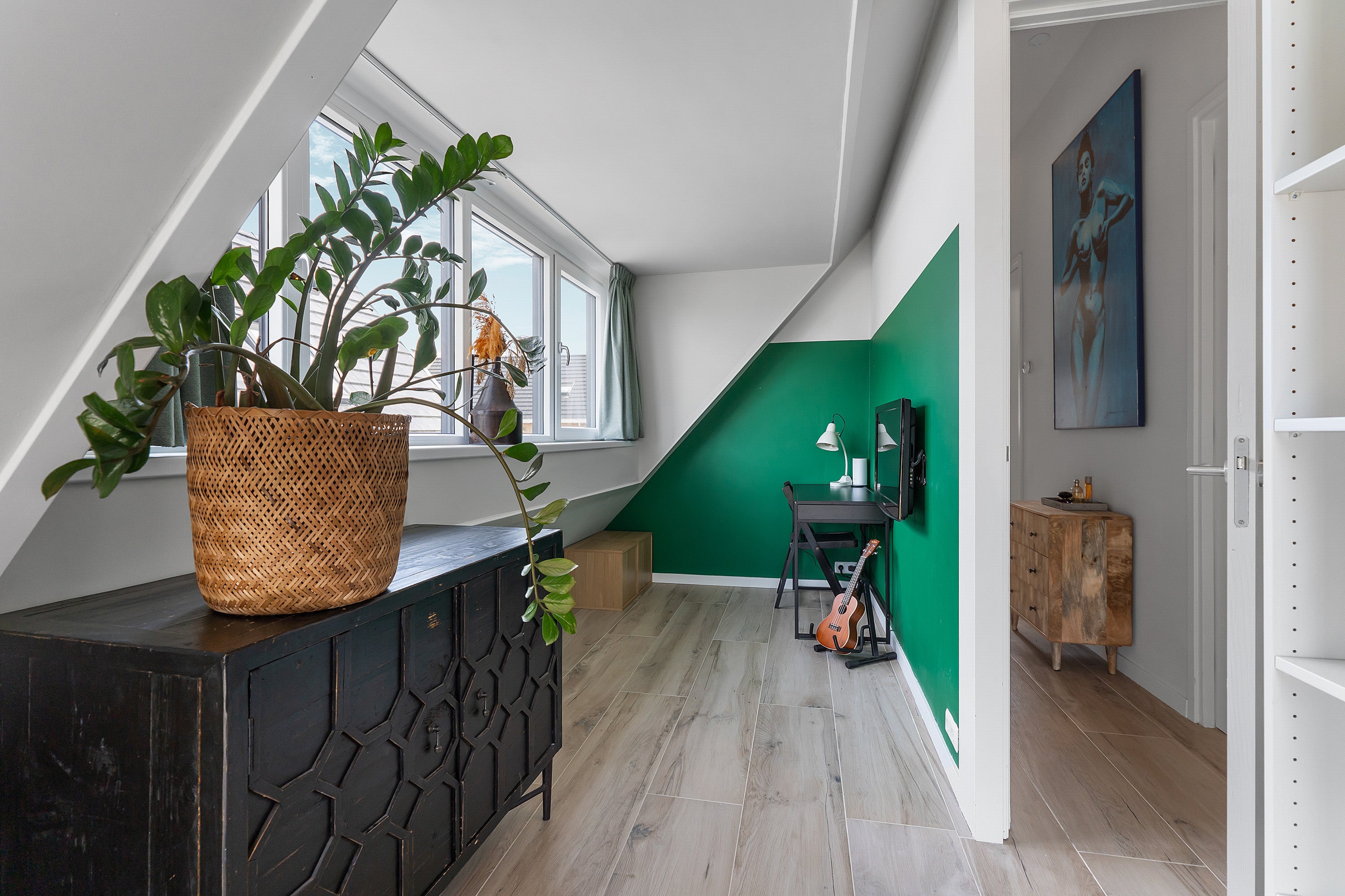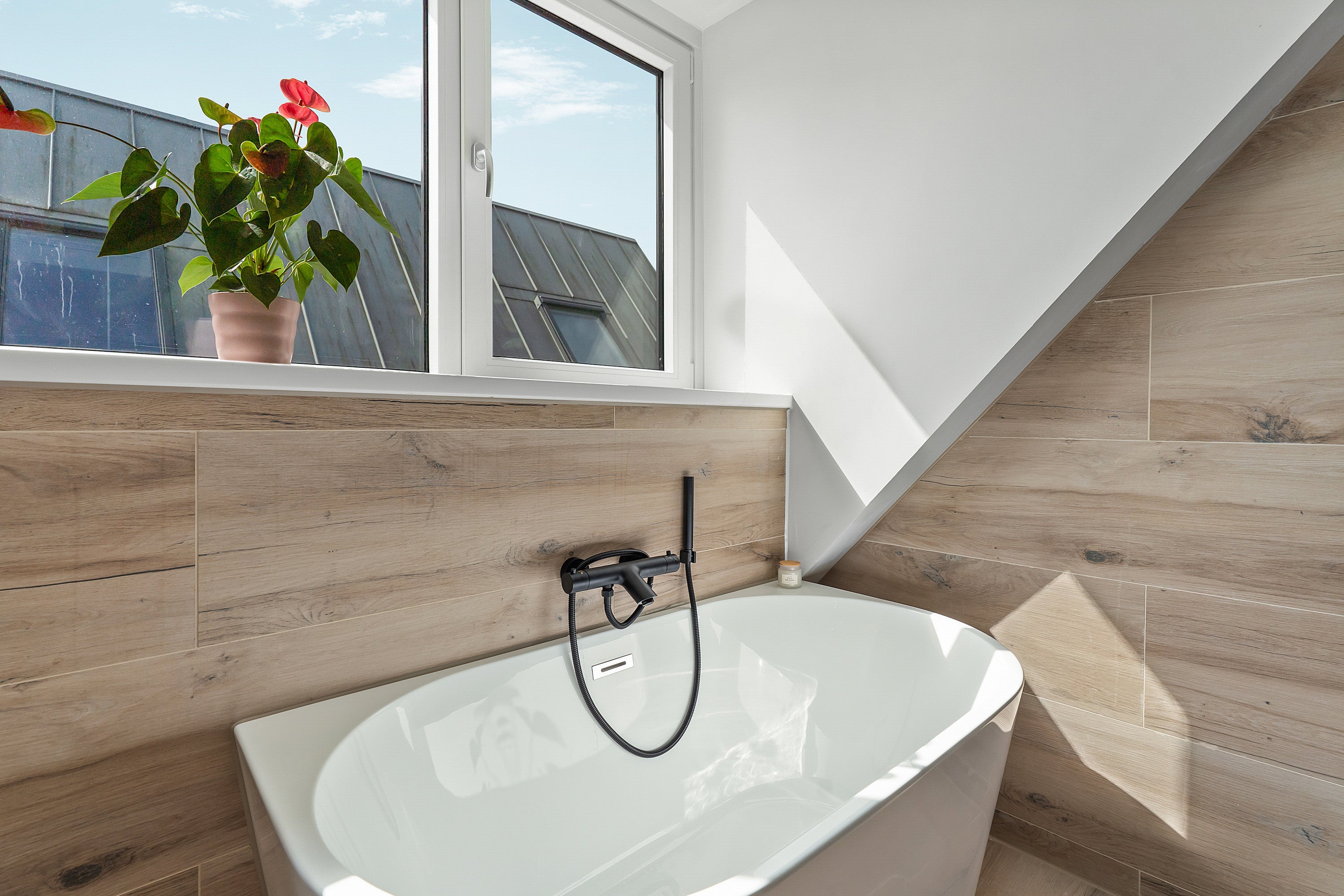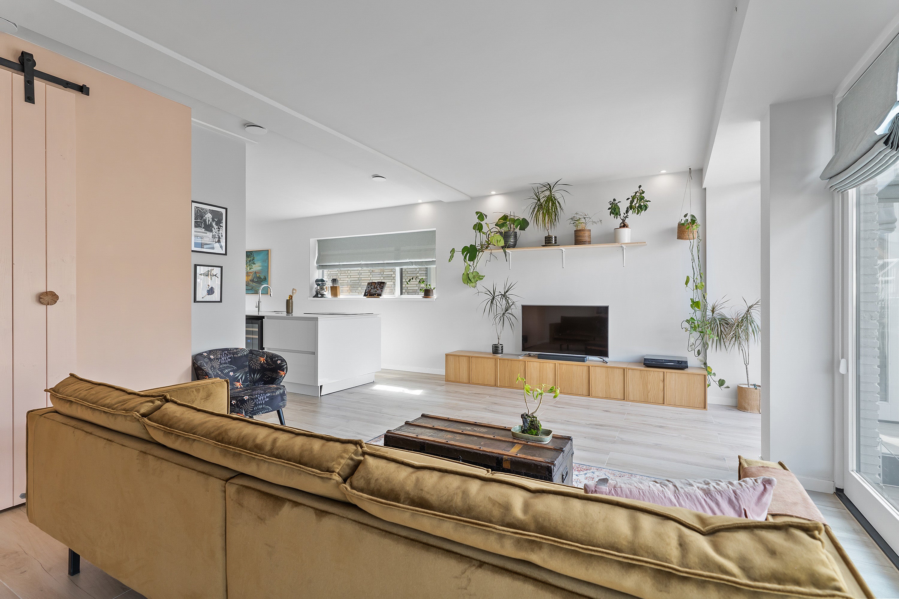 De woonkamer heeft keramisch parket met vloerverwarming en drie openslaande deuren naar het zonnige terras, perfect voor buitenleven. De eerste verdieping is uitgebreid met twee dakkapellen, waardoor extra ruimte is gecreëerd. De luxe badkamer is voorzien van een inloopdouche, ligbad en wastafelmeubel.