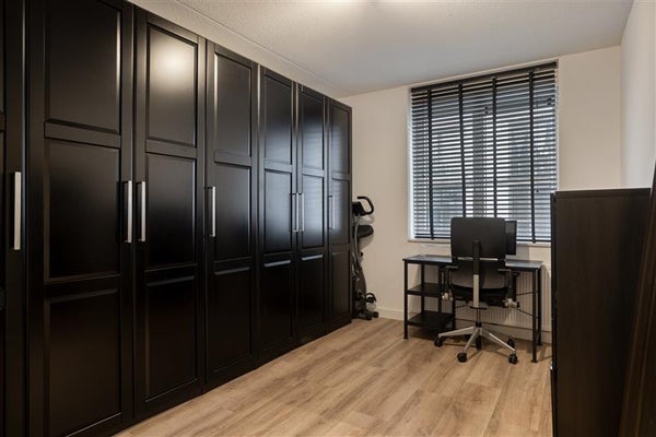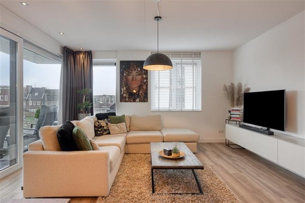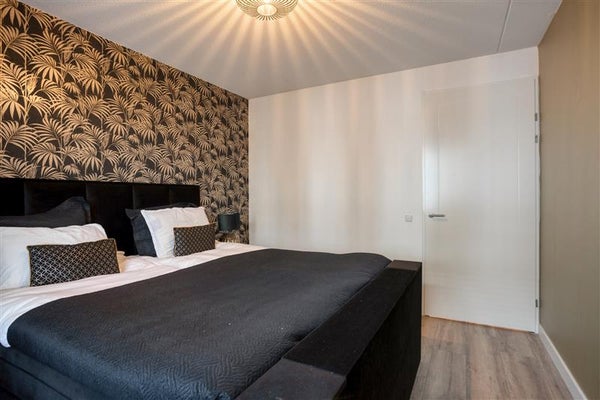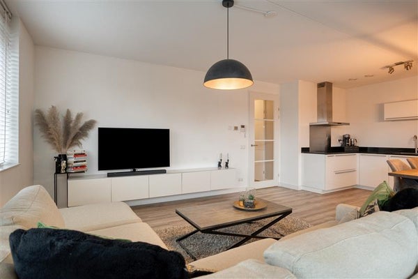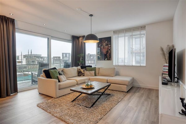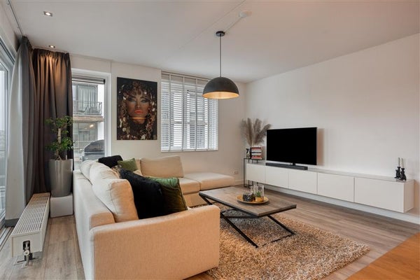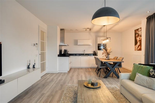 In het gehele appartement is gekozen voor een hoogwaardige laminaatvloer en strakke wanden, wat het moderne en uniforme karakter benadrukt.