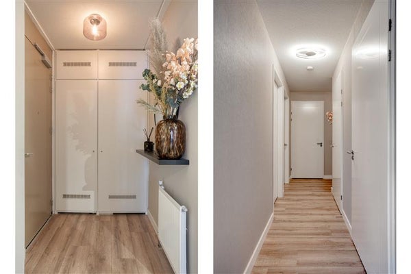 Je betreedt het appartement via een gezamenlijke entree, compleet met handig bellentableau, trap én lift. Op de eerste verdieping word je via de voordeur verwelkomd in een lichte hal, waar je direct de meterkast, de aansluiting van stadsverwarming, een separaat toilet en een praktische wasruimte/voorraadkast aantreft.