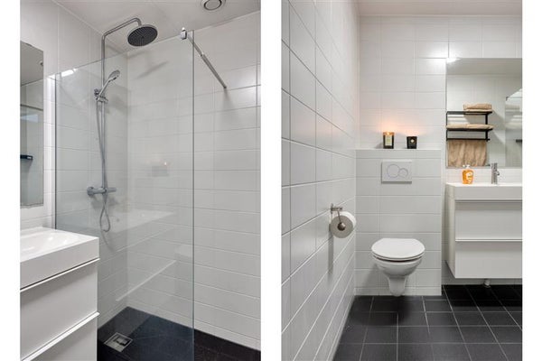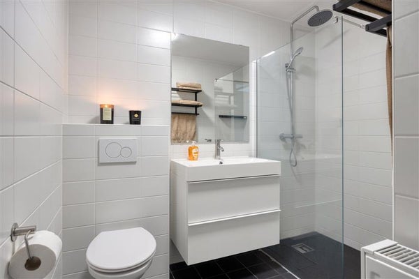 De verzorgde badkamer is strak afgewerkt en voorzien van een inloopdouche, een wastafelmeubel én een toilet. Functioneel, modern en fris! De ruimte is praktisch ingedeeld, waardoor je alles bij de hand hebt en toch geniet van een luxe uitstraling. Hier begin je de dag goed en spoel je 's avonds de hectiek van je af in alle comfort.