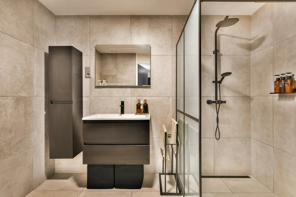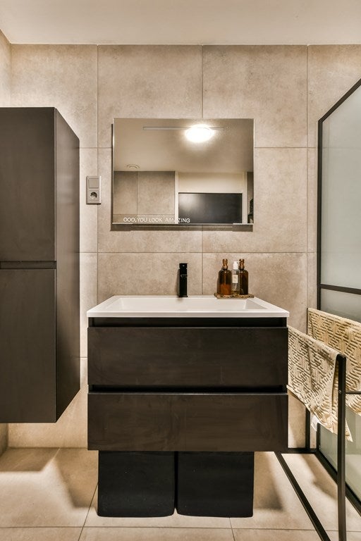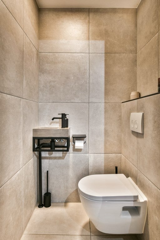 Vanuit de hal zijn de badkamer en het toilet toegankelijk. Beide ruimtes zijn in dezelfde stijl gemoderniseerd.