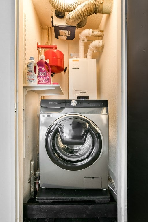 Een aparte kast zit in de hal met wasmachine aansluiting en opbergruimte.