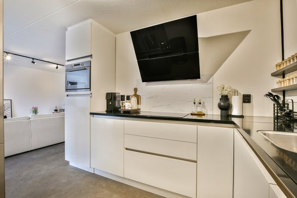 De open keuken is voorzien van Pelgrim inbouwapparatuur en heeft door de hoekopstelling veel aanrecht- en kastruimte.