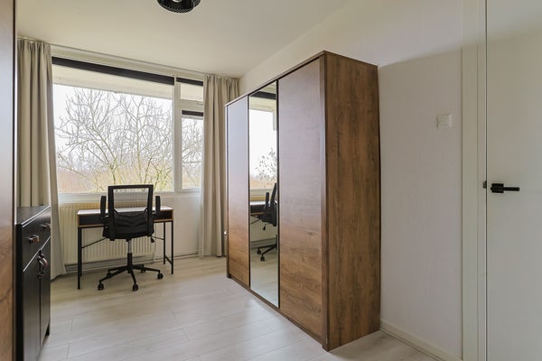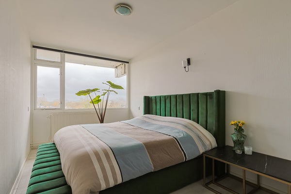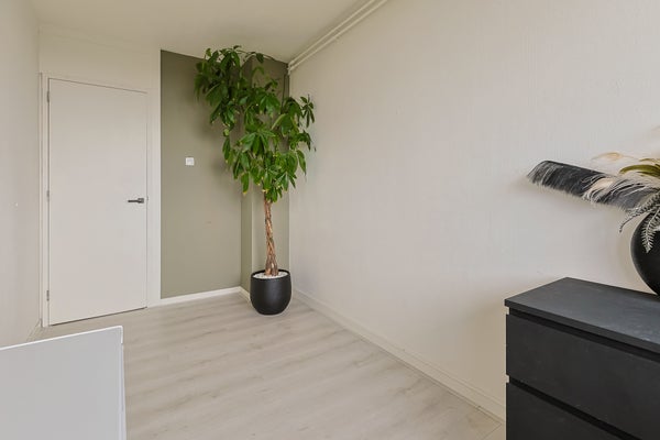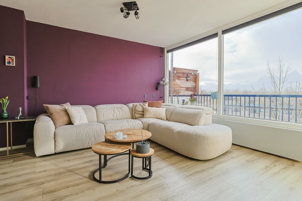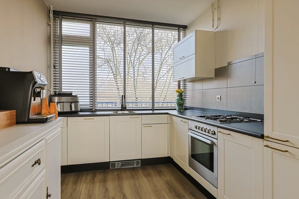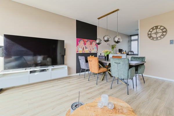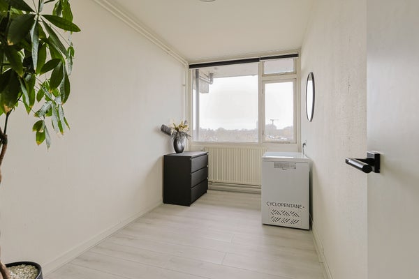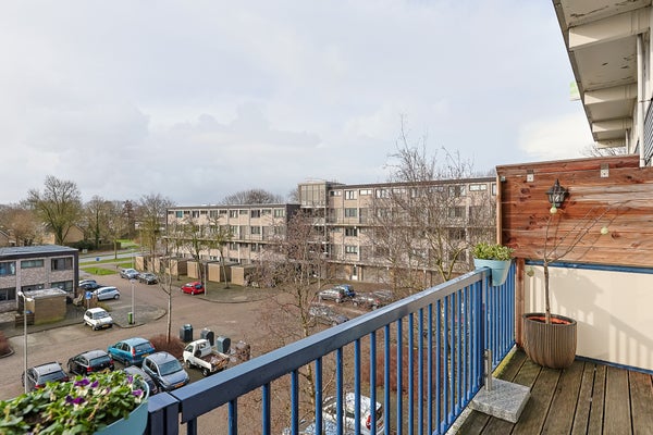 Vanuit de hal stap je de de woonkamer met veel lichtinval binnen. Het is een heerlijke verblijfsruimte en beschikt over een praktische trapkast en een deur naar het woningbrede balkon op het zuiden. Het balkon biedt genoeg ruimte om hier lekker met meerdere personen te kunnen zitten. Vanuit zowel de woonkamer als het balkon heb je een fraai uitzicht. De ligging is perfect: hoog genoeg voor privacy en een weids uitzicht over de bebouwing, maar niet zo hoog dat het contact met de omgeving verloren gaat.