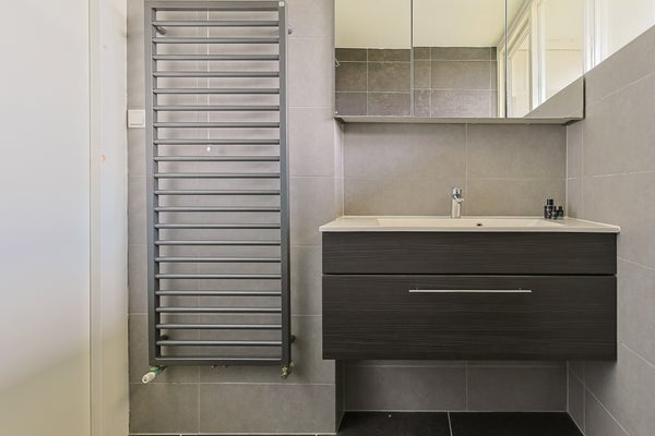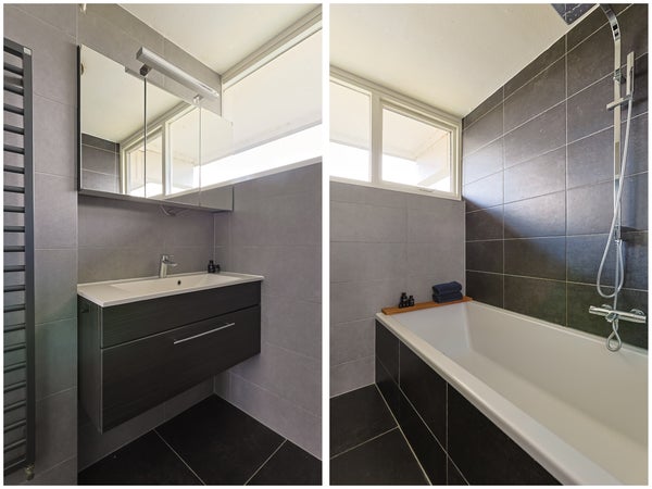Op deze verdieping bevinden zich drie goed bemeten slaapkamers, waarvan twee aan de voorzijde (ca. 4.55x2.70 m + 4.12x2.17 m.) en één aan de achterzijde (ca. 4.70x2.70 m.). De nette badkamer is voorzien van een ligbad/douchecombinatie, designradiator, een wastafelmeubel met brede wastafel en spiegelkast met verlichting. De badkamer heeft een mooie donkergrijze en zwarte tegel.