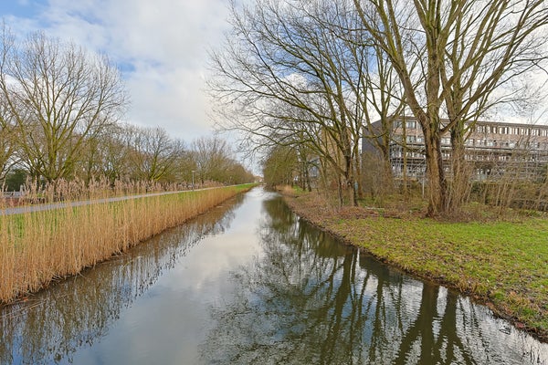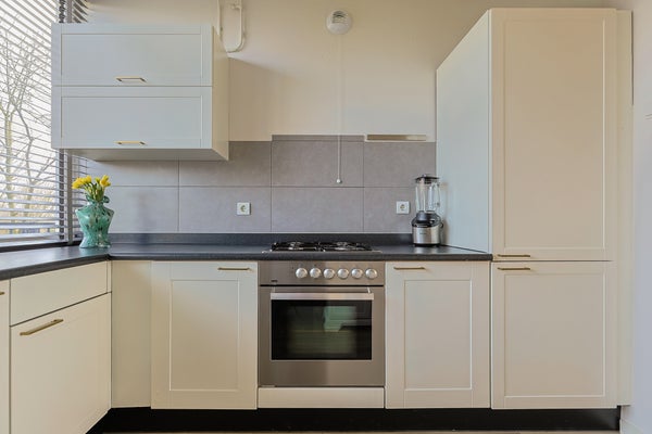 Aan de voorzijde bevindt zich de open keuken met een L-vormig keukenblok en creme kleurige fronten. De keuken is uitgerust met een gaskookplaat, oven, vaatwasser en een koel-vriescombinatie. Vanuit de keuken kijk je uit over een brede groenstrook en het water, wat zorgt voor een prettig en vrij gevoel.