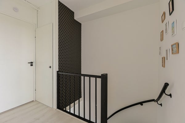 Entree/hal met meterkast, trapopgang naar de slaapverdieping en recent vernieuwde toiletruimte. De toiletruimte is voorzien van hangend closet en fonteintje en er is gekozen voor een mooie marmerenlook tegel. Ook is de hal mooi afgewerkt met akoestische houten wandpanelen.