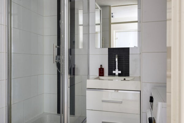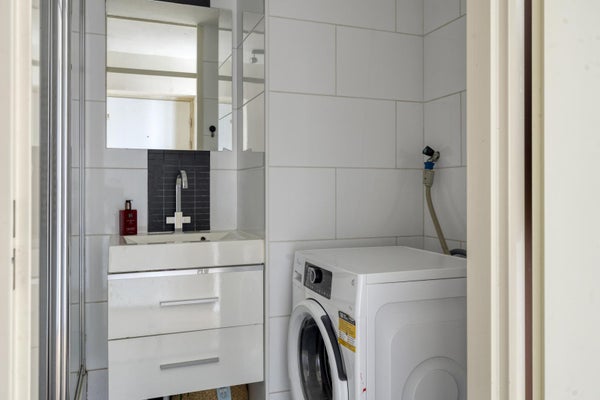 De badkamer is modern afgewerkt en voorzien van een douche, wastafelmeubel en aansluitingen voor de wasmachine. Het toilet is separaat.