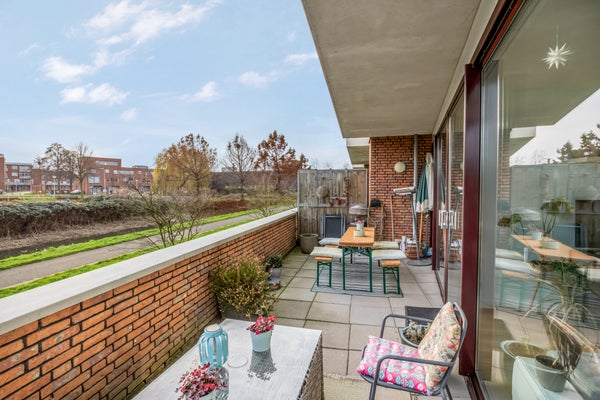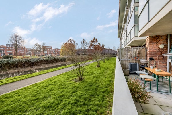 Een van de voordelen van dit appartement is de buitenruimte. Het terras aan de voorzijde is op het westen, perfect voor zon tot in de late uurtjes. De ochtendzon en vroege middagzon vind je bij het tweede terras, met mooi uitzicht naar het groen en het water.
