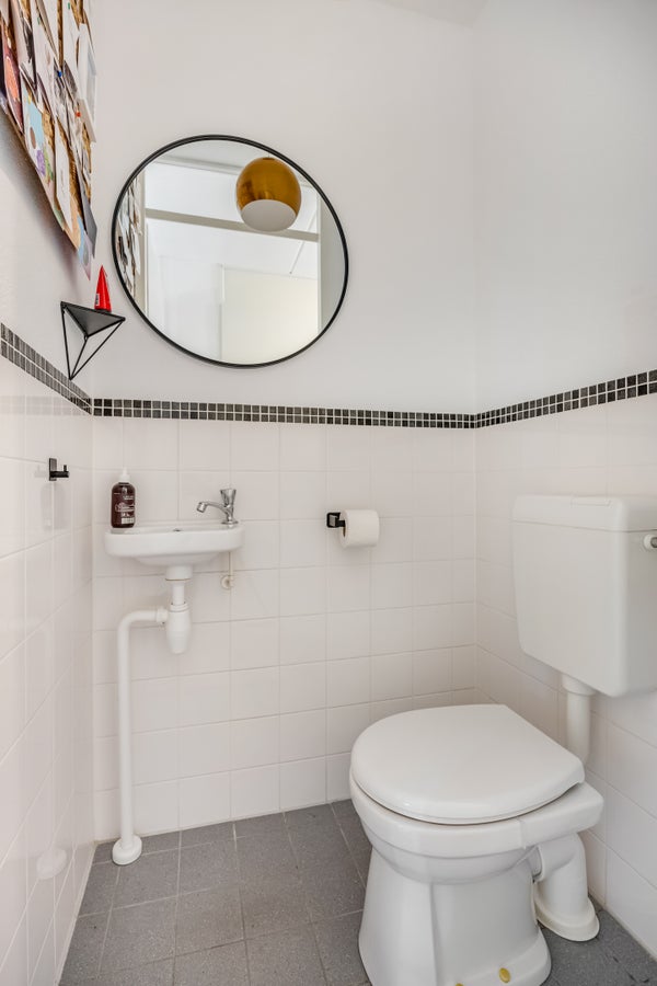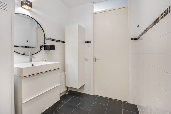 In het midden van het appartement zijn de toiletruimte, meterkast, een bergkast, de badkamer en een berging/wasruimte. De badkamer, uitgevoerd in wit en zwart, is ingedeeld met een inloopdouche met regendouche, een badmeubel met wastafel en een hoge wandkast. In de naastgelegen berging/wasruimte is genoeg ruimte voor een wasmachine- en drogeropstelling, schoenenrek en andere spullen neer te zetten.