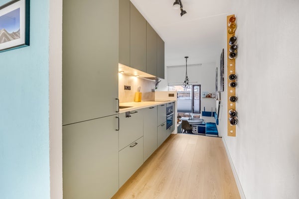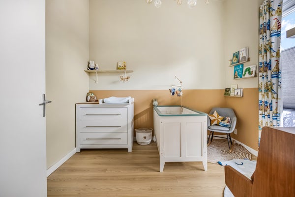 Aan de achterzijde is de sfeervolle master bedroom, met een schuifpui naar het terras. Deze kamer is groot genoeg voor een tweepersoonsbed, een schuifdeurkast en een ladekast. De tweede slaapkamer, aan de voorzijde, is nu ingericht als kinderkamer. Dankzij de hoogte is er ruimte voor een hoogslaper, een slimme oplossing die gegarandeerd in de smaak valt bij oudere kinderen.