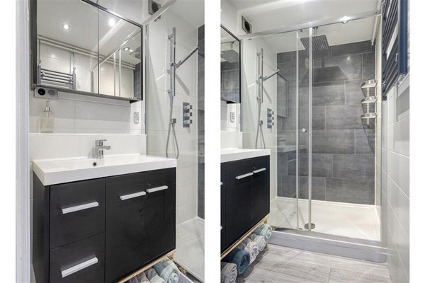 De badkamer is modern en comfortabel ingericht en beschikt over een luxe inloopdouche met regendouche, een wastafelmeubel en een designradiator. Praktisch én stijlvol.